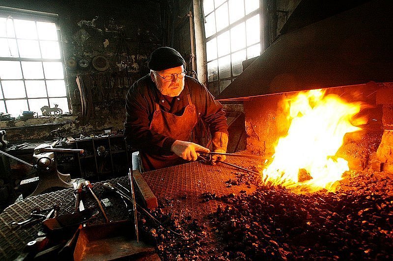 Oft ranken sich Erzählungen um die Objekte, die Werner Gerke mit Feuer und Hammer formt. Wie die Geschichte des Drachen. "Der hat im Teutoburger Wald gelebt, bis er von einer Maus verjagt wurde. In der Schmiede hat er Zuflucht gefunden, weil es seine Lieblingsspeisen - Kohlen - gibt." Oder um ein kleines Glöckchen: "Das hat der Weihnachtsmann zur Reparatur abgegeben", berichtet Werner Gerke Kindern. "Bis jetzt hat er sie nicht abgeholt." Wenn es der Rotrock mit seinen Schlitten nicht ins Freilichtmuseum geschafft hat, vielleicht schafft er es dann zumindest bis ins verkehrsgünstiger gelegene Donop.