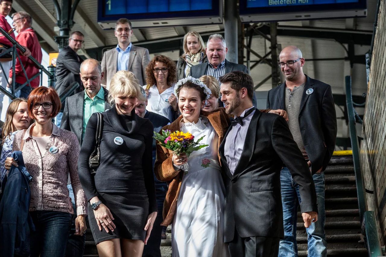 Detmold. Der Jubel war groß, als das Brautpaar vor der Bahnhofsgastronomie das Band vor dem Eingang durchtrennte und der Brautstrauß dann in die Menge geworfen wurde. Aus der großen Menschentraube heraus gab es kräftigen Beifall für die beiden – wie auch für „Pastor“ Markus Hottgenroth. Denn dieser Kern der Hochzeitsgesellschaft hatte in den vorausgegangenen Stunden für reichlich Unterhaltung bei den Fahrgästen gesorgt. Schließlich wurde eigentlich gar nicht geheiratet, sondern ein Theaterstück aufgeführt, in dessen Zentrum die vier Schauspieler des Landestheaters standen. Im Verlauf der von Hottgenroth konstruierten Handlung kam es dabei zu einem dramatischen Kriminalfall, in den die fahrenden Theatergäste mit eingebunden wurden. Sie alle waren als Ermittler und Detektive Teil des Geschehens. Ein Unterfangen, welches am Ende für beste Unterhaltung gesorgt haben dürfte – der kräftig aufbrandende Applaus der Menge ließ diesen Schluss jedenfalls zu.