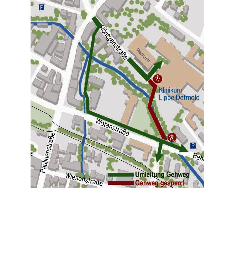 „Eigentlich hätte die Sperrung erst kommen sollen, wenn die neue Brücke errichtet worden ist“, berichtet Projektleiter Detlef Wehrmann von der Stadt Detmold. Dann habe es jedoch Verzögerungen gegeben. Der Baubeginn wurde verlegt, weil noch nicht alle Unterlagen vorlagen – zum Beispiel die Abbruchgenehmigung für die alte Parkpalette am Klinikum. Außerdem hätten wegen des Abbrisslärms Schutzzeiten für das Krankenhaus eingehalten werden müssen, welche sich insgesamt auf etwa eine Woche summiert hätten.