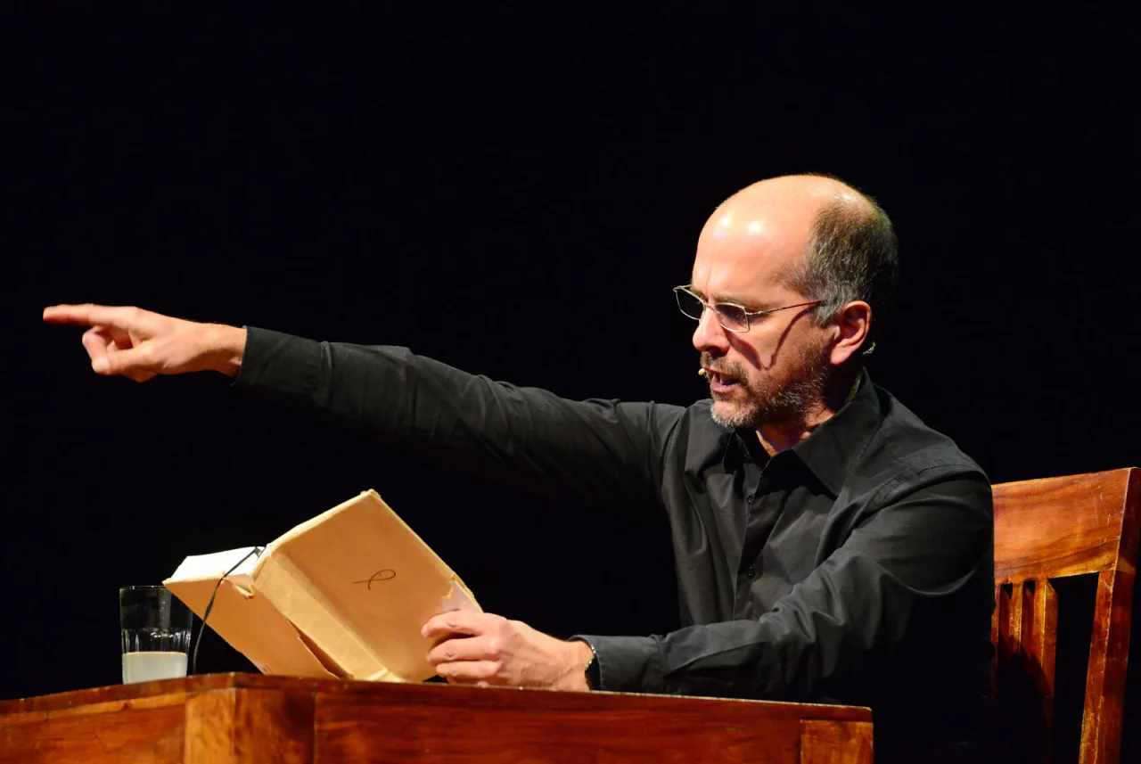 So darauf eingestimmt, dass bei allem Humor auch die andere, die nachdenkliche Seite der Satire nicht zu kurz kommen würde, machte es Sinn, sich ganz auf die Worte des am Holztisch sitzenden Lesenden einzulassen. Der begann mit der Anfangssequenz aus dem Buch, in der Adolf Hitler auf einer Berliner Wiese erwacht. Dort, wo er von spielenden Jungen nicht erkannt wird, schätzt er die Situation aus dem ihm bekannten historischen Kontext heraus völlig falsch ein. Die bolzenden Knaben lassen für den sich weiterhin im Krieg Wähnenden nur den Schluss zu: „Der Feind scheint eine Ruhephase eingelegt zu haben.“ Sein Irrglaube, der auf dem Trikotrücken aufgedruckte Name zeige ihm, dass hier „Hitlerjunge Ronaldo“ spiele, ist dabei eine erste sehr komische Verquickung.