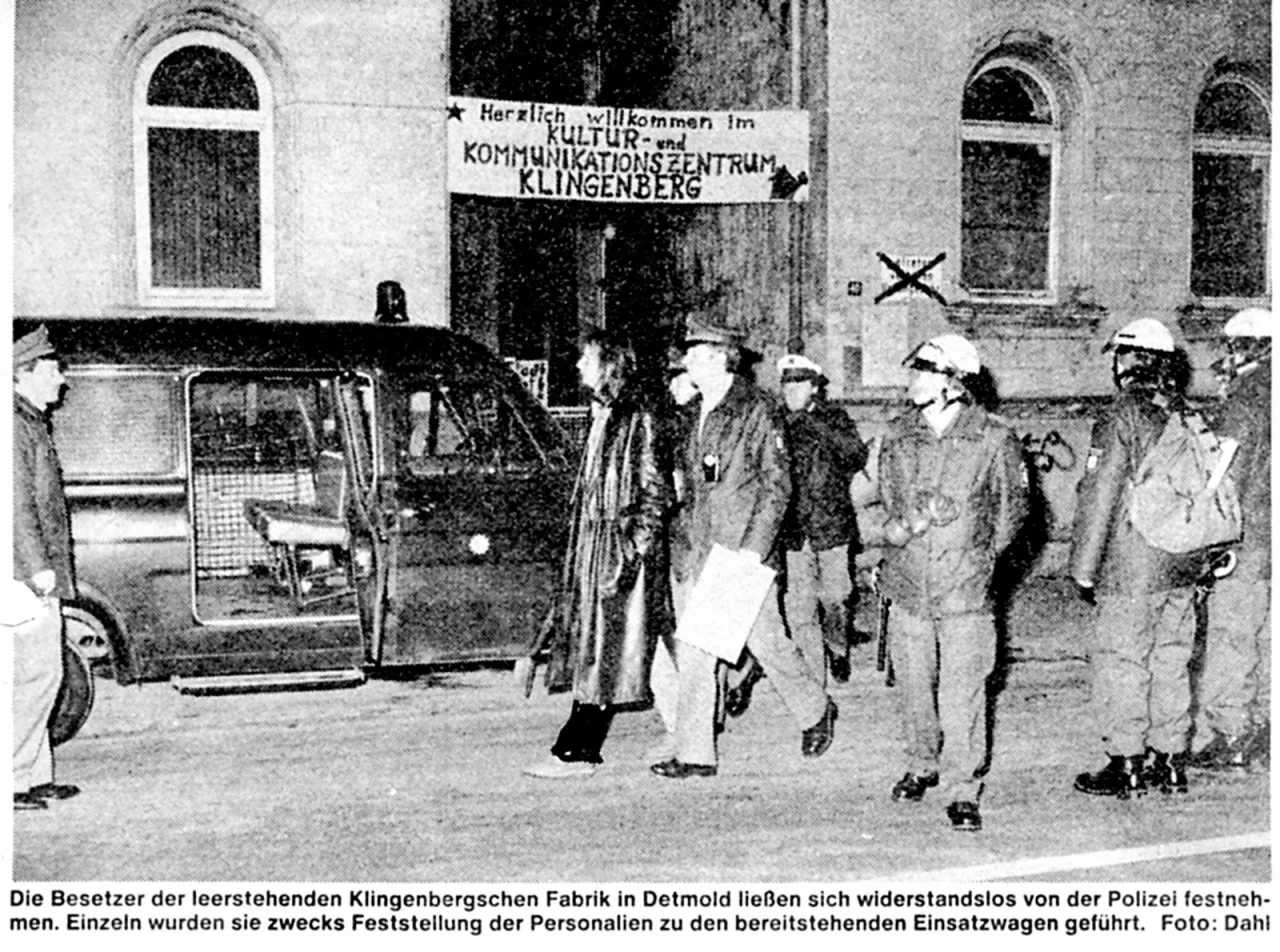 Detmold. "Die Klingenbergsche Fabrik in Detmold, ein seit Jahren leerstehender Industriebau, der am 29. November letzten Jahres von jungen Leuten besetzt worden war, wurde gestern morgen von der Polizei geräumt. Die Aktion, die um 4 Uhr begann und an der sich etwa 540 Beamte beteiligten, lief gewaltlos ab."