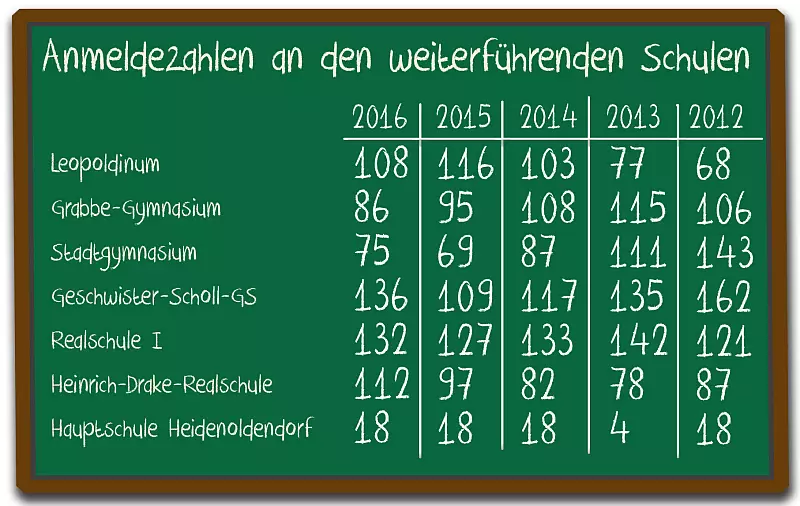 Gymnasien: Insgesamt sind 269 Kinder für das Gymnasium angemeldet worden, elf weniger als im Vorjahr. Die meisten entfallen davon auf das Leopoldinum (108), das seinen Vorjahreswert von 116 Schülern nicht ganz erreicht, aber immer noch auf vier Eingangsklassen kommt. Das Stadtgymnasium wächst mit 75 Anmeldungen (Vorjahr: 69) wieder leicht an und bleibt bei drei Eingangsklassen. Die Zahlen am Grabbe-Gymnasium sinken von 95 auf 86, so dass statt vier nur noch drei Eingangsklassen entstehen können.