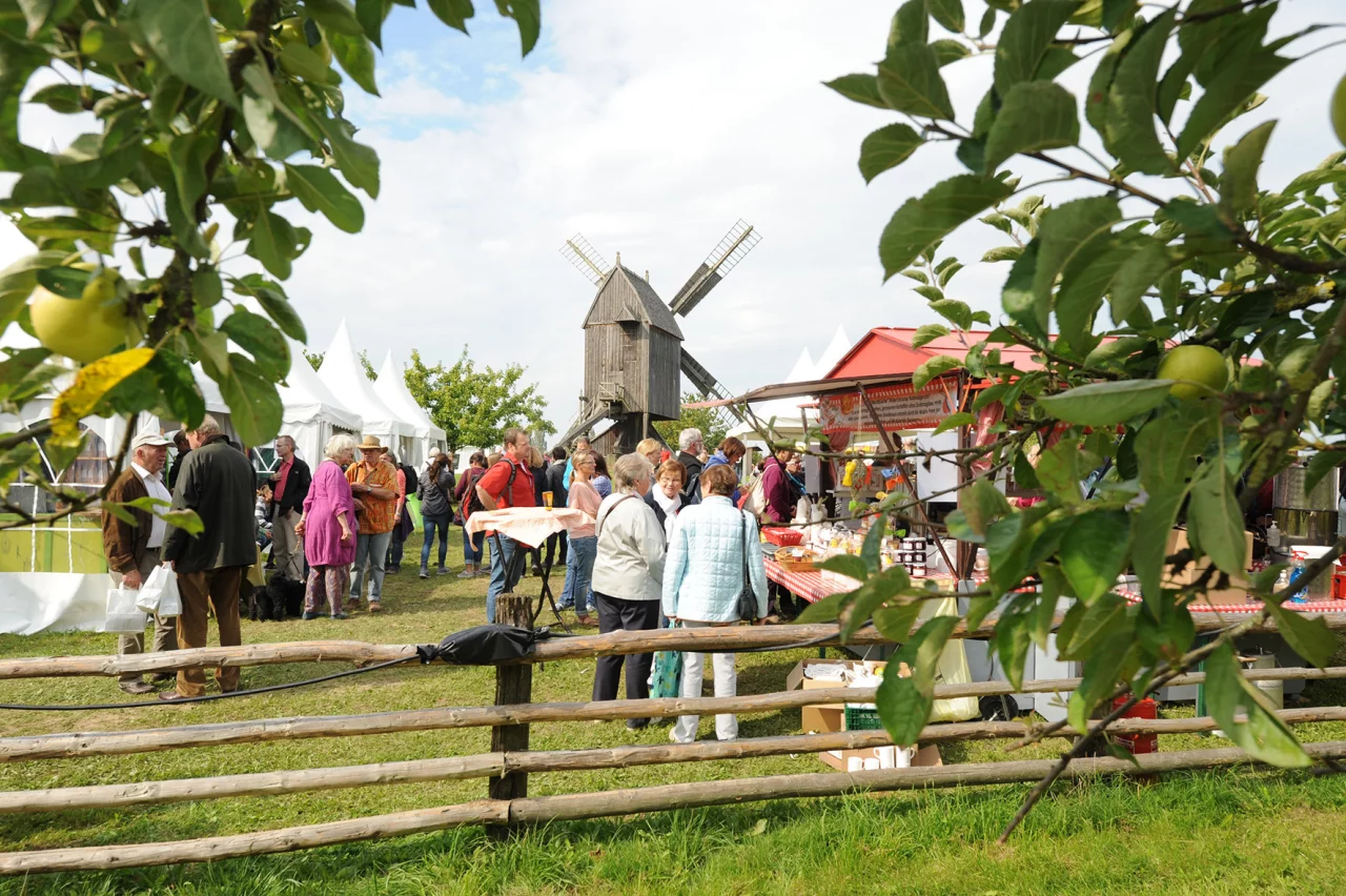 Dem staunenden Publikum zeigte Schäfer Michael Krumme, was seine beiden Hütehunde Roy und Heidi können. Nach seinen Kommandos trieben die Hunde eine kleine Schafherde von der Streuobstwiese in der Nähe der Bockwindmühle vorbei an den Ständen mit Leckereien zum Kartoffelacker von Landwirt Elmar Mues. Der hatte extra für den „Freilichtgenuss" die moderne, festkochende Kartoffel „Allians" angepflanzt, die nun geerntet werden konnte.