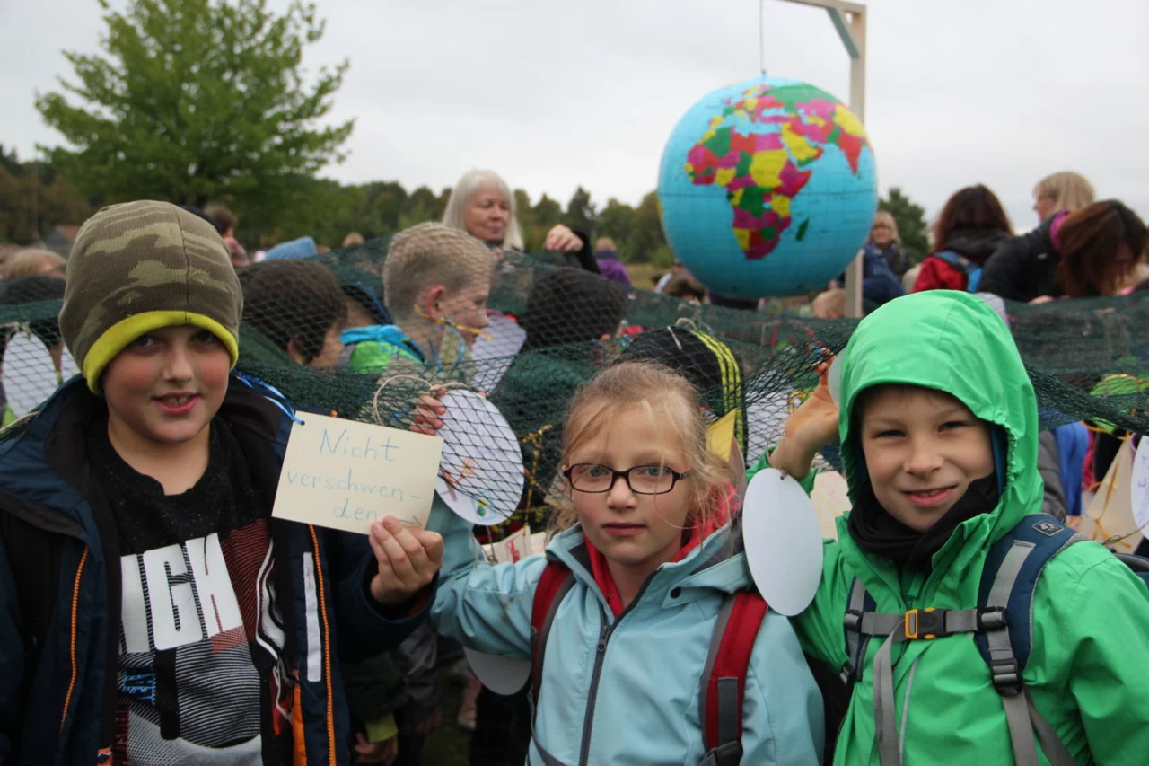 Die Kärtchen, auf denen die Kinder ihre Botschaften und Ideen zum Umweltschutz geschrieben hatten, knoteten sie an ein großes Netz. „Es ist besser, mit dem Fahrrad zu fahren als mit dem Auto", sagte etwa der neunjährige Erik aus der Klasse 4c und zeigte seine Karte. Gemeinsam mit seinen Mitschülern hielt er das Netz symbolisch unter eine große aufgeblasene Weltkugel, die dadurch geschützt werden soll.