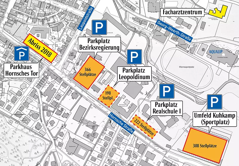 Das Parken: Wird das Parkhaus Hornsches Tor abgerissen, fehlen Parkplätze. Ab 2017 kommen zunächst am Finanzamt neue hinzu – 496. Ab 2022 plant die Stadt mit dem Neubau des Parkhauses Lustgarten mit 600 Parkplätzen – zurzeit sind 100 nicht nutzbar, weil das Parkhaus auch marode ist. Potenziale sieht die Verwaltung an der Bezirksregierung und im Umfeld des Sportplatzes am Kuhkamp. 308 Stellplätze wären machbar, wenn das Fußballfeld zum Parken genutzt würde. Wenn man ein neues Parkhaus an der Bezirksregierung bauen würde, kämen 366 Plätze hinzu. Weitere Varianten wären, Parkdecks auf die bislang schon als Parkplätze genutzten Flächen am Leopoldinum oder an der Realschule aufzusatteln. Das eine könnte 198, das andere 222 Parkplätze erbringen.