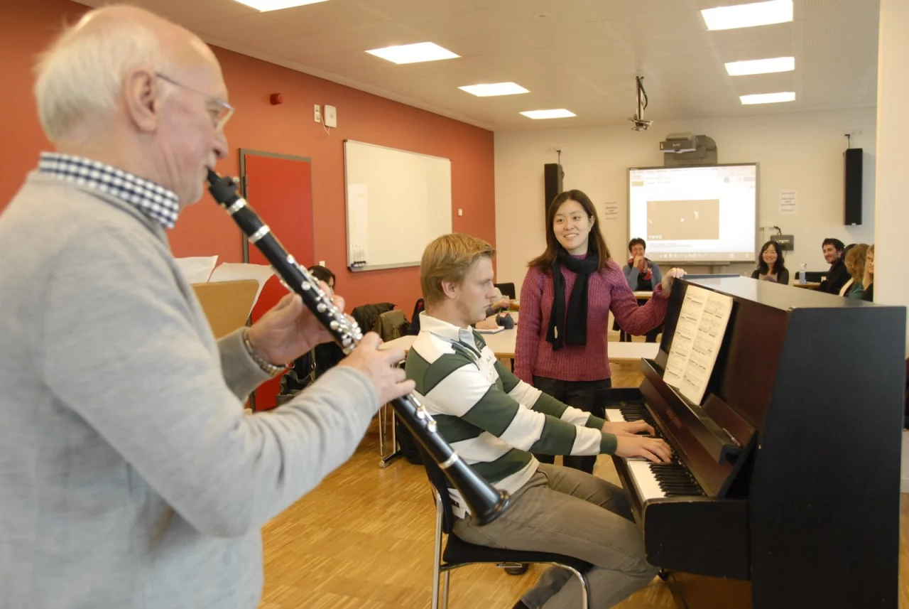 Der 70-jährige Klarinettist Gerd Beckmann hat sich dafür als „Versuchskaninchen" zur Verfügung gestellt. Der passionierte Jazz-Musiker spielt seit 58 Jahren Klarinette – im Zuge des Workshops „55+" ist er zur Hochschule für Musik gekommen. Und nimmt seit gut einem Jahr professionellen Klarinettenunterricht bei der Studentin Linda de Groot. Unter den wachsamen Augen ihrer Kommilitonen haben nun insgesamt vier Studenten probeweise eine Unterrichtseinheit mit ihm leiten dürfen – vom Klavier aus. Währenddessen konnten die Mitstudenten Fragen stellen oder Tipps geben.