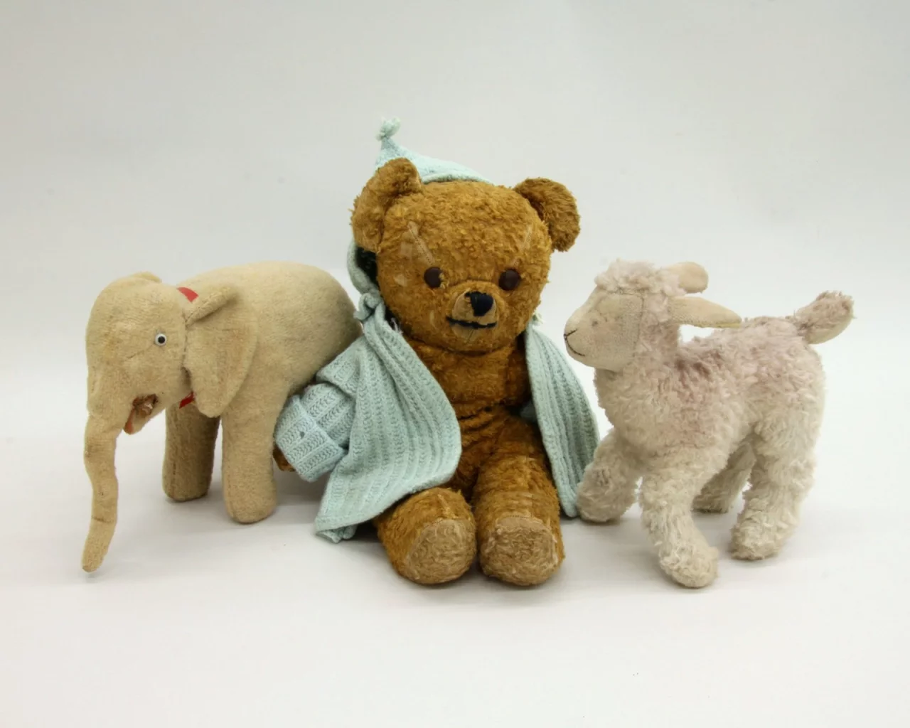 Das Stofftier-Lama bekam die Leihgeberin zu ihrem ersten Geburtstag 1964 von einem Onkel. Es wurde „Iti" genannt. Wie es zu diesem Namen kam, ist in der Familie allerdings nicht mehr bekannt. Der Bär wurde dem Mädchen etwas später von der niederländischen Oma zur Geburt der jüngeren Schwester geschenkt. Das Jäckchen, das er trägt, war die Babyjacke des Mädchens. Und auch ein Elefant gesellte sich zu den Lieblingstieren. Alle drei Tiere haben die Leihgeberin bisher immer begleitet, in jeder neuen Wohnung bekamen sie ihren Platz.