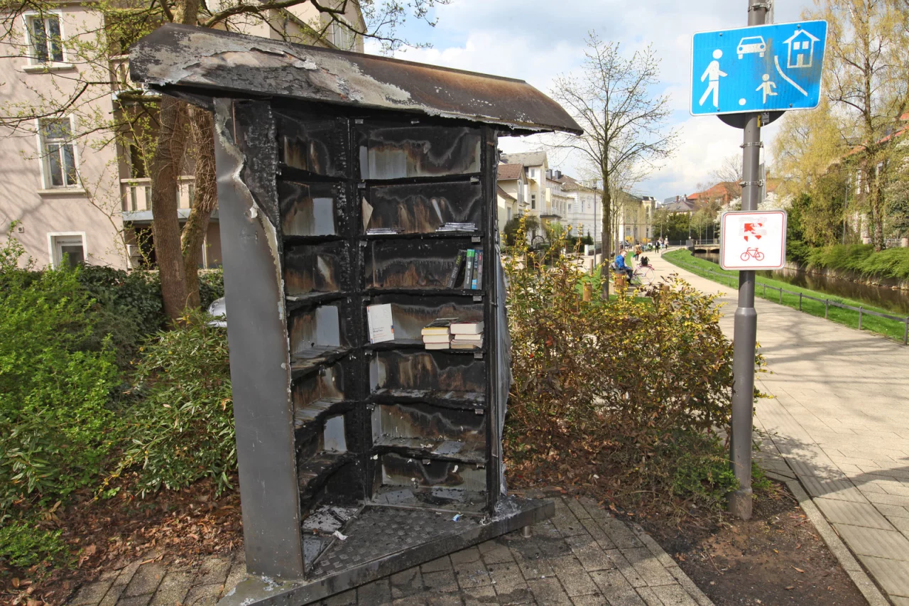 Detmold. Ein trauriger Anblick am Wallgraben: Der öffentliche Bücherschrank, der hier seit vier Jahren steht, ist vollkommen zerstört. Er ist in der Nacht zu Sonntag in Brand gesetzt worden. Als Polizei und Feuerwehr am frühen Sonntagmorgen dort eintrafen, war bereits nichts mehr zu retten.
