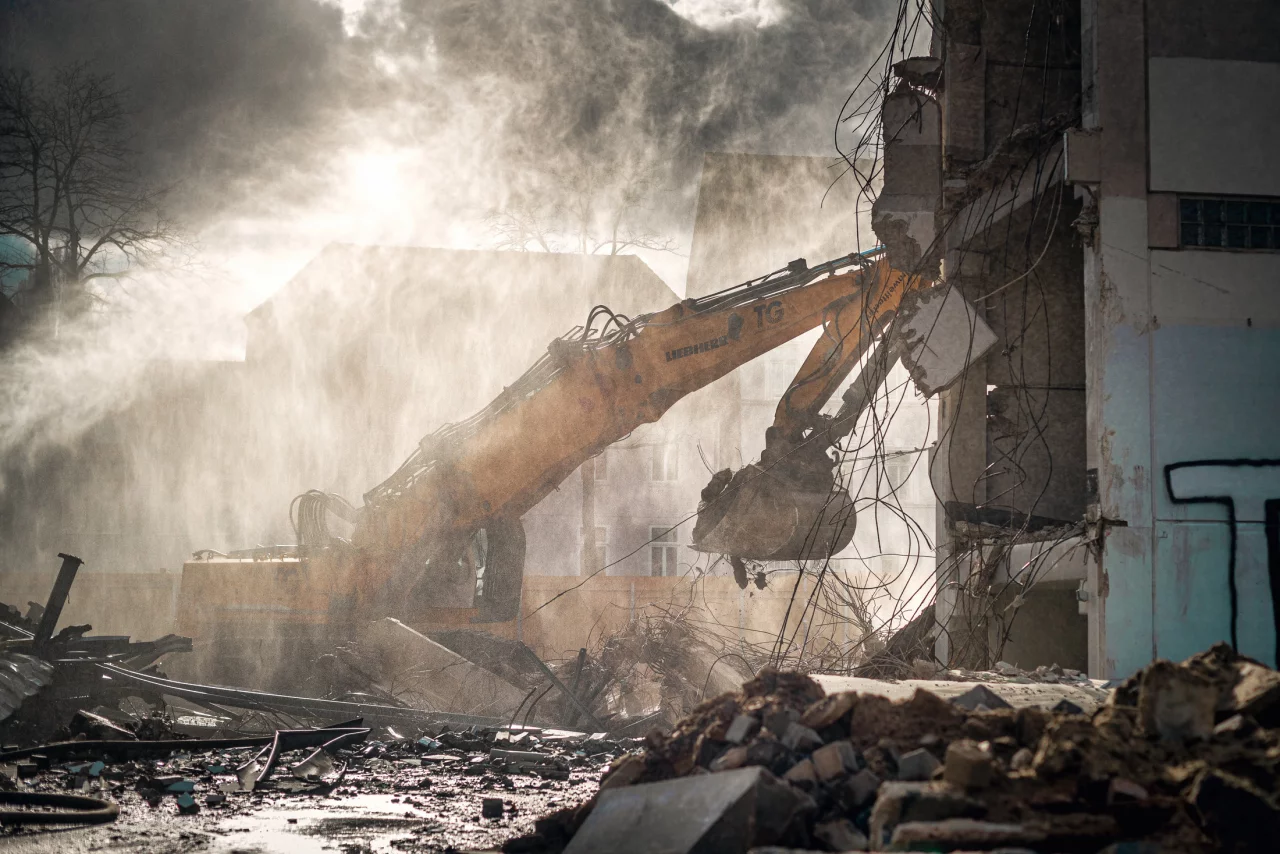 aufgestellt - sie sprüht ohne Unterlass einen feinen Wassernebel auf das alte Parkhaus. "In den kommenden Tagen erwarten wir noch zwei weitere Bagger", sagt Bauleiter Peter Funk. Gemeinsam werden die Maschinen dann das Gebäude abtragen.