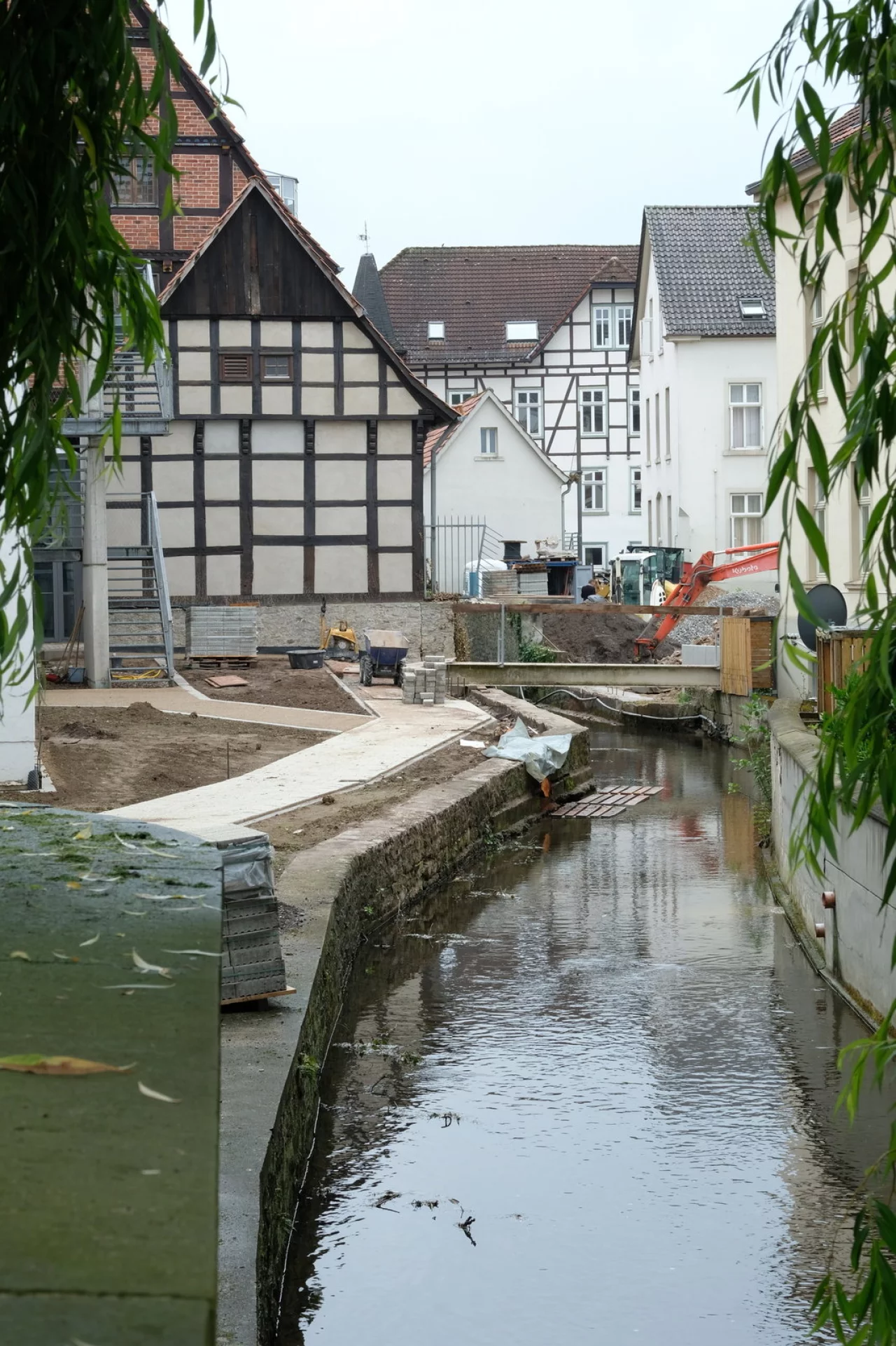 333.000 Euro kostet die Maßnahme hinter der Herberge zur Heimat und dem Landesmuseum. Die barrierefreie Wegverbindung, es entsteht eine Rampe statt der Treppen, wird auf beiden Uferseiten angelegt und mit einer neugeplanten Brücke verbunden – im Hintergrund sind schon die Träger zu sehen. Der Weg wird zukünftig von Stauden- und Bodendeckerflächen gesäumt. Es werden außerdem zwei neue Bäume gepflanzt und zwei Bänke mit Blick auf das Wasser aufgestellt.