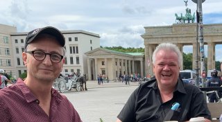 Steffen Stelzer posiert an dem Stück Berliner Mauer auf dem Willy-Brandt-Platz. - © Jana Beckmann