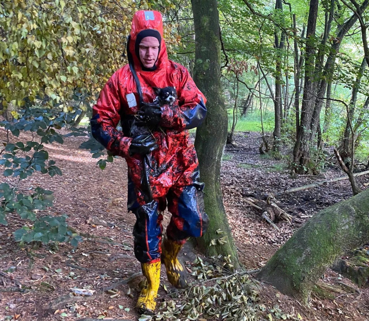 Der mit einem speziellen Wasser-/Eisrettungsanzug geschützte und durch eine Leine gesicherte Kollege konnte Frauchen und beide Hunde aus ihrer Lage befreien und alle drei an das rettende Ufer begleiten, wo sie versorgt wurden.