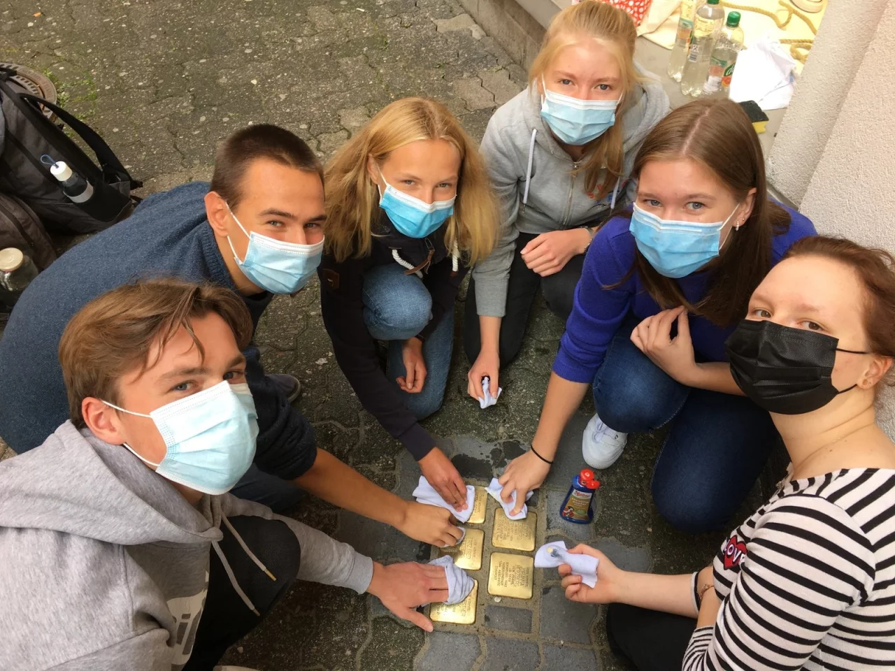Die Gedenksteine erinnern zumeist vor dem letzten frei gewählten Wohnhaus des auf ihnen verewigten, im Zweiten Weltkrieg ermordeten Opfers. Mit Politur und kleinen Stoffstücken in der Hand seien sie den staubig in der Sonne glänzenden Steinen zu Leibe gerückt, heißt es in einer Pressemitteilung der Schule. Während auf dem Boden kniend und vollkommen vertieft die golden glänzenden Steine poliert worden seien, sei schließlich auch Joanne Herzberg zur Gruppe dazugestoßen.