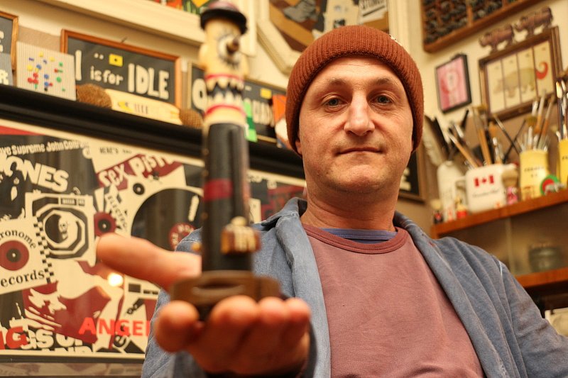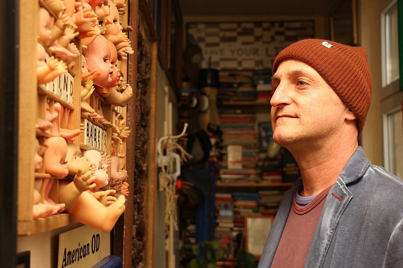 Einige Impulse hat Ralf Ellers auch von seiner elfjährigen Tochter Mina bekommen. Etwa als er vor einem Setzkasten saß und darüber nachdachte, wie man zerteilte Puppenkörper richtig einordnen könnte. „Die sehen ja aus, wie die Bilder, die ich male", soll seine Tochter damals gesagt haben. Gemeint waren typisch kindlich gezeichnete „Kopffüßler" – Figuren mit Kopf und Füßen, nur ohne Körper. Schon stand der Plan für das Projekt fest, für das er minuziös allen Puppenköpfen die Haare entfernte. Ralf Ellers nimmt sich viel Zeit für seine Kunst. Jährlich entstehen in etwa vier Bilder und zwei Holzfiguren. Viele seiner Werke sind persönlich, daher auch unverkäuflich. „Die Kontrolle abzugeben und nicht zu wissen, was mit den Bildern passiert, wär für mich unerträglich", sagt Ellers. Dennoch schätzt es der 51-Jährige, wenn er seine Bilder ausstellen und den Menschen zugänglich machen kann. „Am besten sind dafür öffentliche Orte – besser als im Museum." Zuletzt zogen einige Bilder im Schaufenster des leerstehenden Luftballongeschäfts in der Detmolder Innenstadt die Blicke auf sich. Bis der Laden weitervermietet wurde. „Es ist schon irre, wie erstaunt gerade Kinder vor den Holzfiguren stehen."