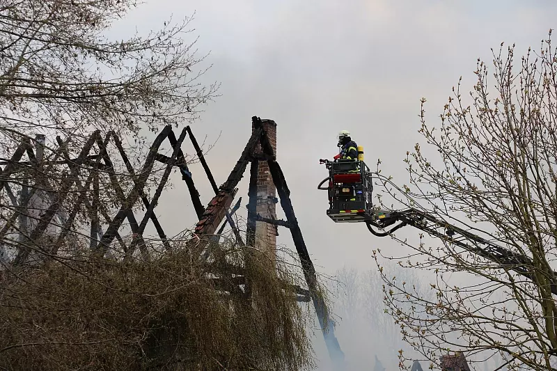 Die Polizei nimmt noch am Nachmittag die Ermittlungenwegende des Verdachts der fahrlässigen Brandstiftung auf, kann das Gebäude jedoch wohl frühestens am Donnerstag betreten – wenn das bis dahin überhaupt möglich sein sollte. „Es sind schon Teile der Fassade eingestürzt, das ist momentan zu gefährlich", sagt Marco Schweiger vor Ort. Deshalb sei es für die Einsatzkräfte bei den Löscharbeiten sehr wichtig, auf genug Abstand zum Brandobjekt zu achten, schließlich könnte der übrig gebliebene Dachstuhl noch zusammenbrechen oder den Helfern gar entgegenkommen. Ein Gutachter der Polizei hält sich dennoch schon im Hintergrund bereit, während die Wassermassen unaufhörlich auf die übrig gebliebene Ruine des Daches spritzen.