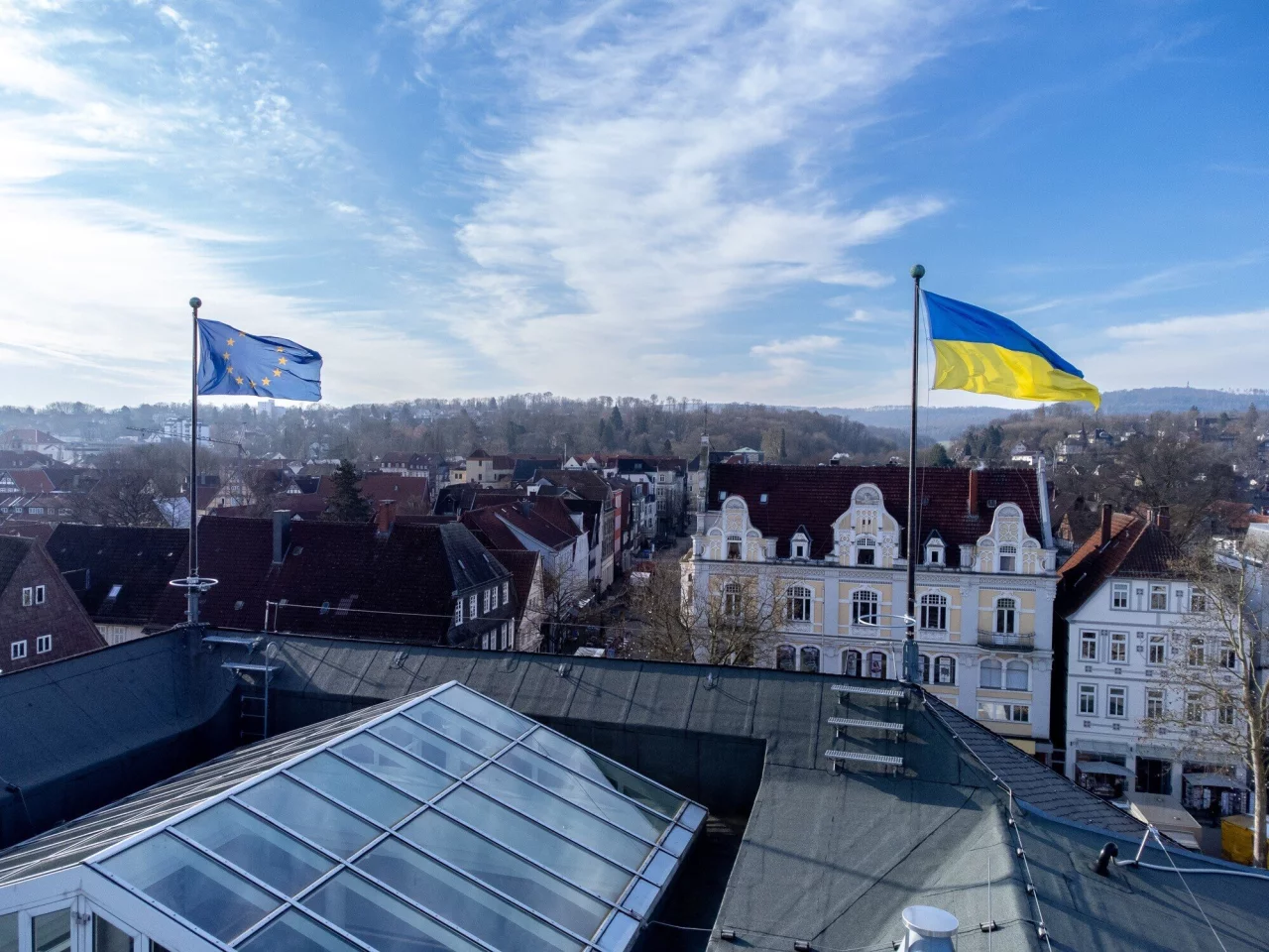 Auf dem Rathaus wehen seit Montag die Flagge der Ukraine sowie der europäischen Union. „Die Flaggen stehen für die eindeutige Botschaft, dass es sich bei der Ukraine um einen souveränen europäischen Staat handelt, der völkerrechtswidrig angegriffen wird", so Bürgermeister Frank Hilker.