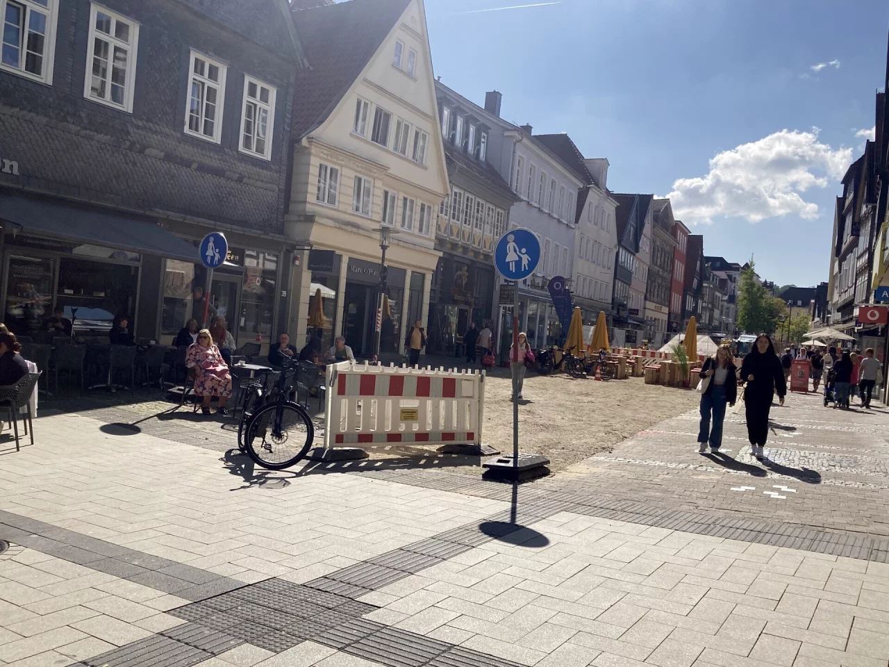 Die Gewerbetreibenden hätten diesen Wunsch gegenüber Baustellen-Kommunikator Peer Reese geäußert. "Konkret wird der Bauzaun nicht mehr in Schritten von zwölf Metern zurückgenommen, wie es ursprünglich einmal gedacht war. Vielmehr ist die Lange Straße zwischen Marktplatz und Strates Brauhaus jetzt wieder für Fußgänger nutzbar. Die Fläche ist mit Schotter und Splitt verdichtet worden", erklärt die Stadt Details.