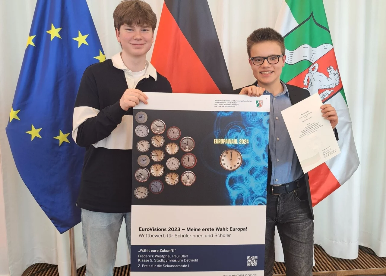 Detmold/Düsseldorf. Das Stadtgymnasium Detmold hat zum dritten Mal beim landesweiten Foto- und Filmwettbewerb „EuroVisions“ gewonnen: Frederick Westphal und Paul Blaß errangen laut Mitteilung der Schule in der Kategorie „Foto/Sekundartufe I“ den mit 500 Euro dotierten zweiten Platz.