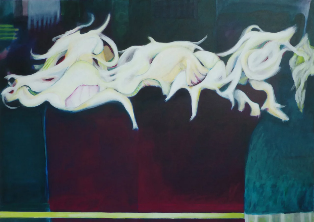 Angelika Leßmeier-Neuling zeigt in ihrem Bilderzyklus „Schwebewesen“ abstrakte Malerei: „Da gleiten organische Formen wie schwebende Kreaturen über die Flächen. Der Hell-Dunkel-Kontrast korrespondiert mit intensiver Farbigkeit, wodurch eine Anmut von Leichtigkeit und Schwere entsteht.“