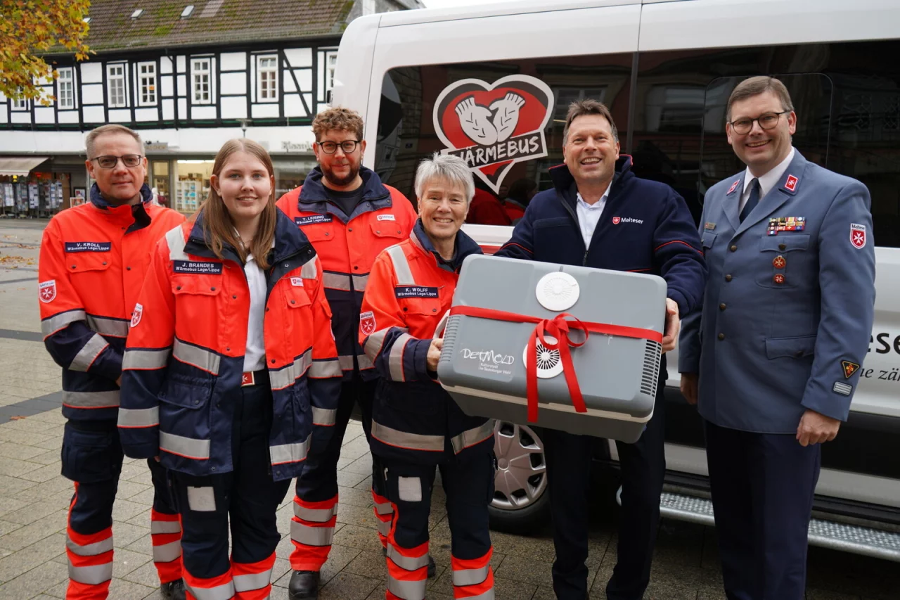 Beim Besuch des Wärmebusses auf dem Detmolder Marktplatz hat Frank Hilker einen Blick ins Innere des Fahrzeugs geworfen. Als Geschenk für die Erstausstattung hat er den Verantwortlichen eine Thermobox überreicht, in der die benötigten Lebensmittel künftig fachgerecht transportiert werden können. Ende November werde das Fahrzeug im Beisein des Schirmherrn feierlich gesegnet.