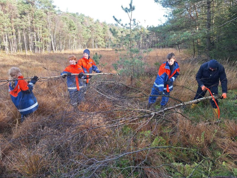 Um den speziellen Moorlebensraum zu erhalten, sei es daher notwendig, aufkommende junge Birken und Kiefern innerhalb des Moores zurückzuschneiden. „Seit vielen Jahren können wir bei der Durchführung der Arbeiten auf die tatkräftige Unterstützung der Jugendfeuerwehr Detmold Jugendgruppe Hiddesen zählen“, schreibt die Station. So auch beim diesjährigen Pflegeeinsatz, bei dem die Biologische Station von 10 Mitgliedern der Jugendfeuerwehr und deren Betreuern sowie von einigen Anwohnern und Naturfreunden unterstützt worden ist.