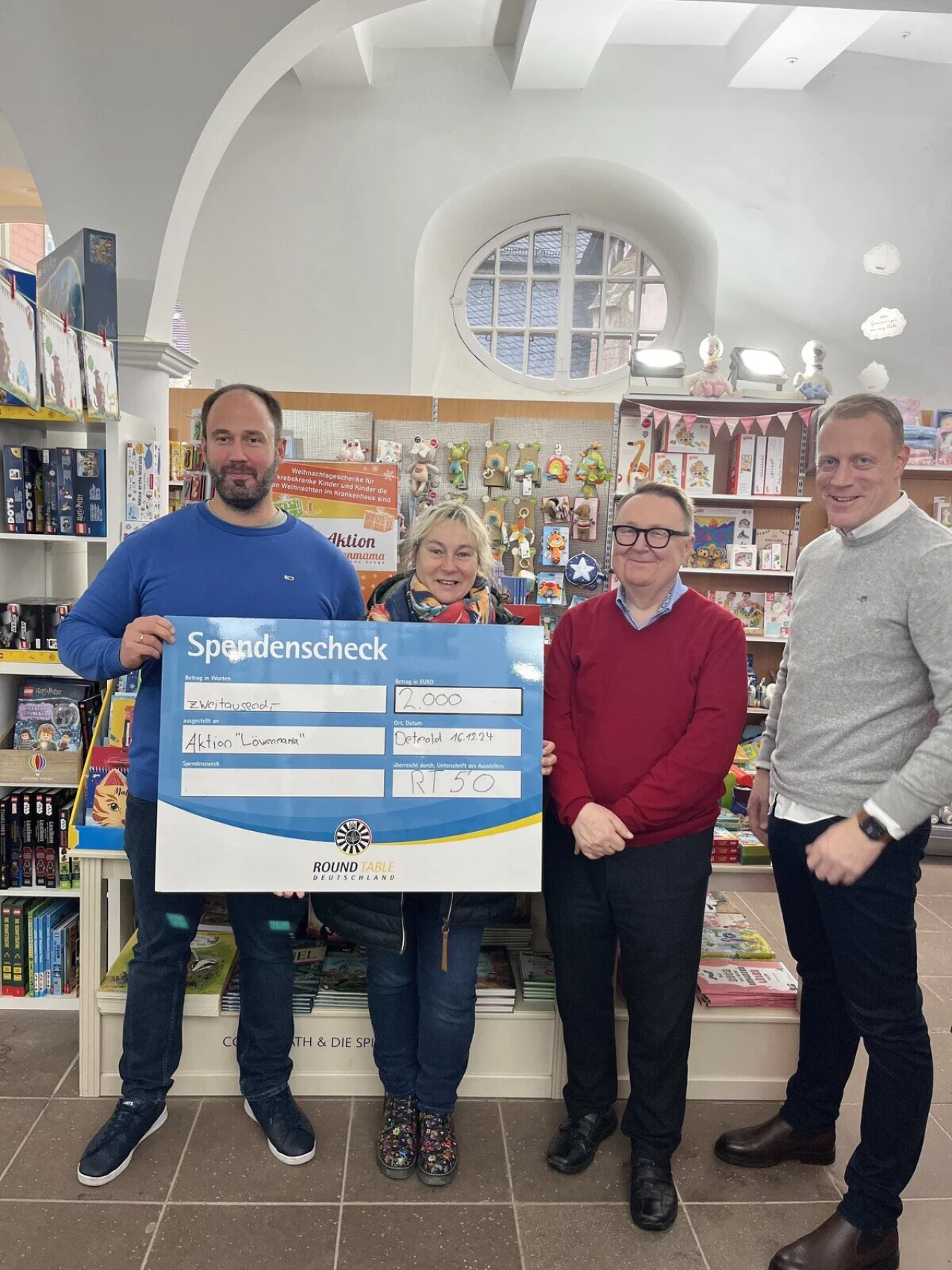 „Mit der Spende wurde ein Geschenketisch im Buchhaus am Markt in Detmold eingerichtet, an dem liebevoll ausgewählte Präsente für die kleinen Patientinnen und Patienten zusammengestellt wurden. Die Übergabe erfolgte dort direkt an Susanne Saage, die mit ihrem unermüdlichen Einsatz unzähligen Kindern zu Weihnachten eine Freude macht“, schreibt der RT 50 Lippe.