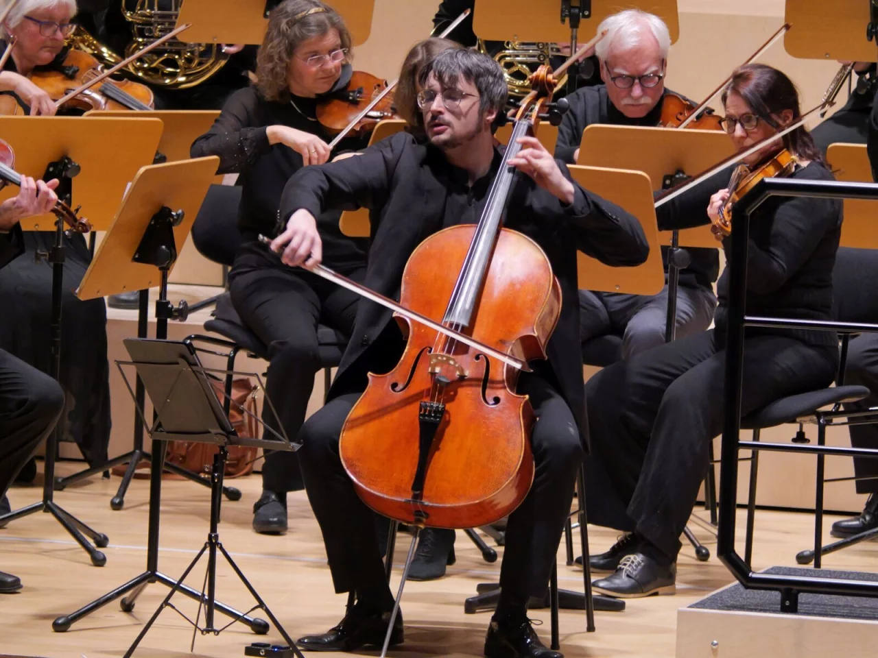 Ein Höhepunkt des Abends war Robert Schumanns Konzert für Violoncello und Orchester a-moll, op. 129. Das Konzert erlebte erst vier Jahre nach Schumanns Tod im Jahr 1860 seine Uraufführung. Wie eine suchende Seele gleitet das Solocello sehnsüchtig durch ein unheimliches Geisterreich und durchlebt viele Emotionen. Als Solist brillierte André Gunko, der mit einem warmen, nuancierten Ton und tiefem Ausdruck imponierte.