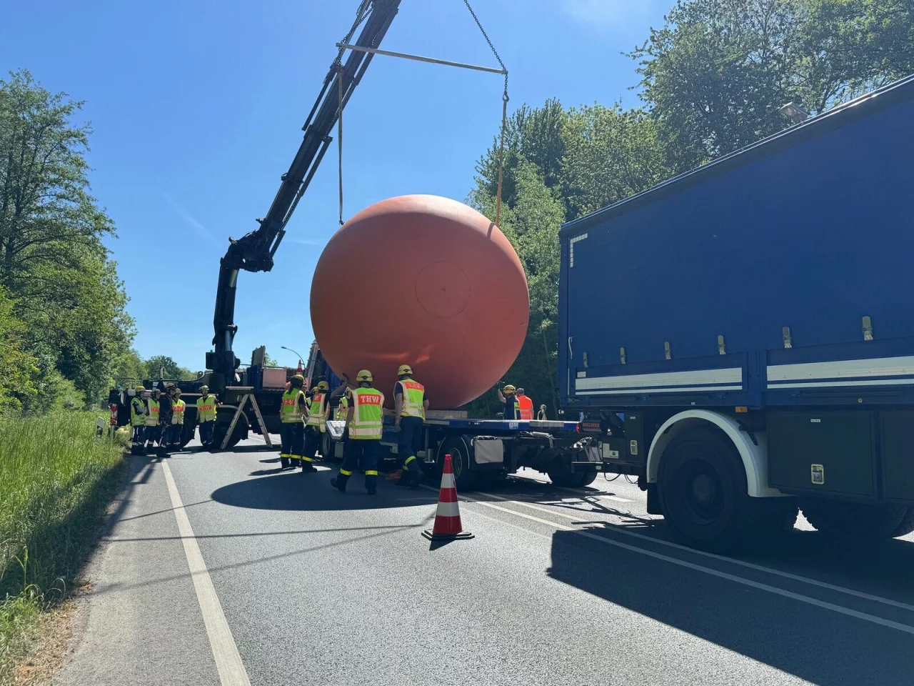 Bergung und Abtransport der Kugel vollzogen sich am Sonntag sehr schnell. Für den Abtransport der Kugel mit 4,5 Metern Durchmesser war ein Sondertransport erforderlich. Das Technische Hilfswerk Detmold rückte um 10 Uhr mit einem Tieflader an, das THW Bielefeld kam mit einem Kran, um die Stahlkugel zu bergen und auf den Tieflader zu verfrachten. Nach rund dreieinhalb Stunden war der Einsatz abgeschlossen und die Kugel im städtischen Bauhof deponiert.