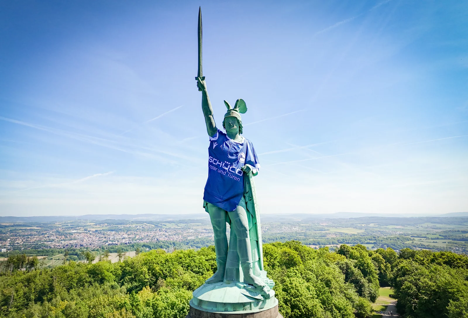Die symbolträchtige Einkleidung der höchsten Statue Deutschlands wird unterstützt vom Landesverband Lippe. Mit der neuerlichen spektakulären Aktion soll die Euphorie rund um das bevorstehende DFB-Pokalfinale am 24. Mai noch einmal spürbar gepusht werden: Arminia Bielefeld steht nach einer beeindruckenden Pokalsaison im Endspiel gegen den Erstligisten VfB Stuttgart und passt damit perfekt in die Rolle des sportlichen Underdogs. Ähnlich wie seinerzeit Hermann oder Arminius der Cherusker, der vor über 2000 Jahren mit seinen Horden im Teuto die Römer vom Platz gefegt haben soll.