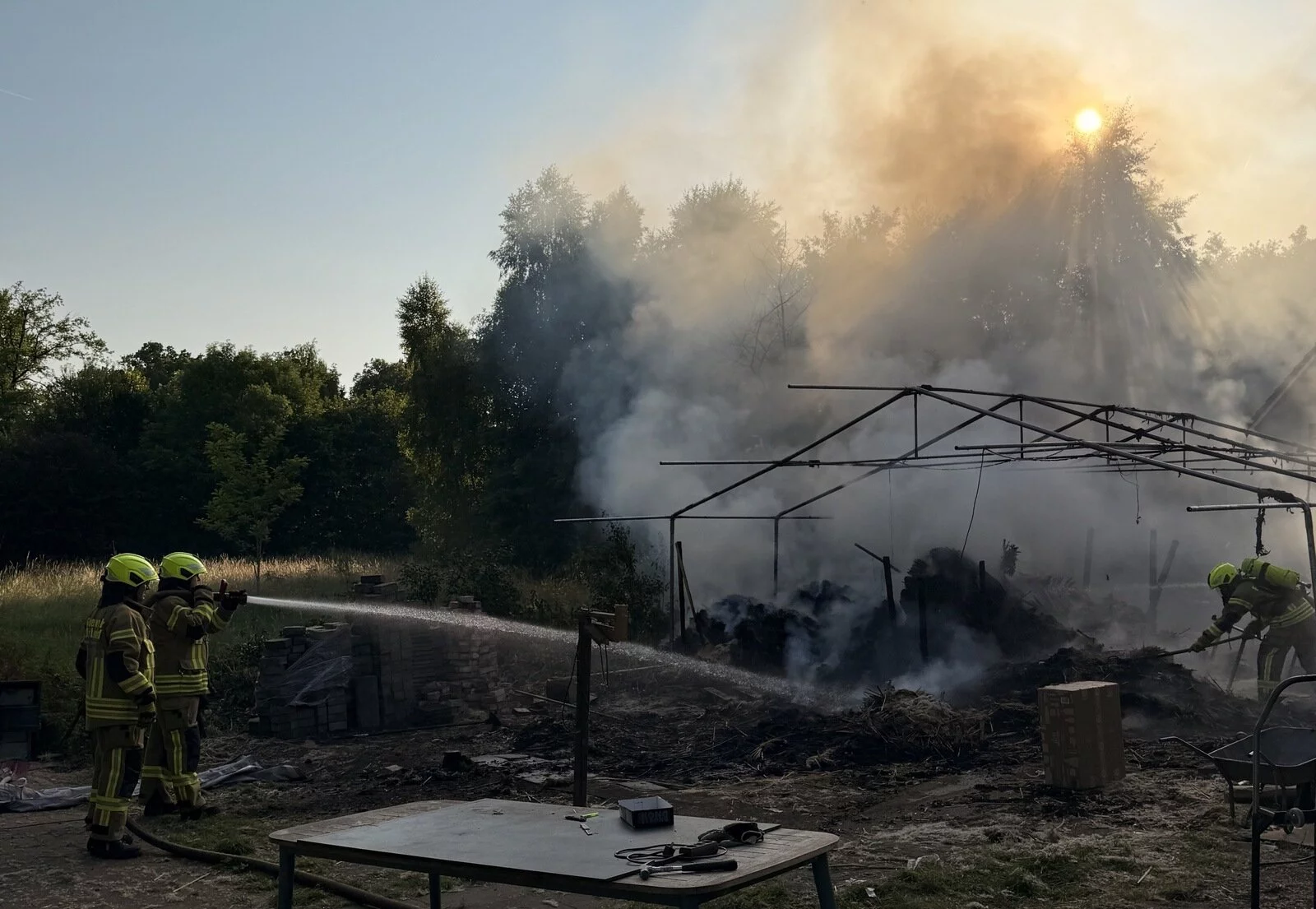 Bereits während der Anfahrt war eine starke Rauchentwicklung sichtbar. Vor Ort stellte sich heraus, dass nicht die Vegetation, sondern ein Unterstand mit großen Mengen gelagertem Pampasgras in Brand geraten war. Aufgrund der sommerlichen Witterung und der engen Lagerung der Ballen wurde der Teleskoplader zur Einsatzstelle beordert, um das Brandgut auseinanderzuziehen und gezielt ablöschen zu können, so die Feuerwehr. Die Nachlöscharbeiten gestalteten sich zeitintensiv und aufwendig.