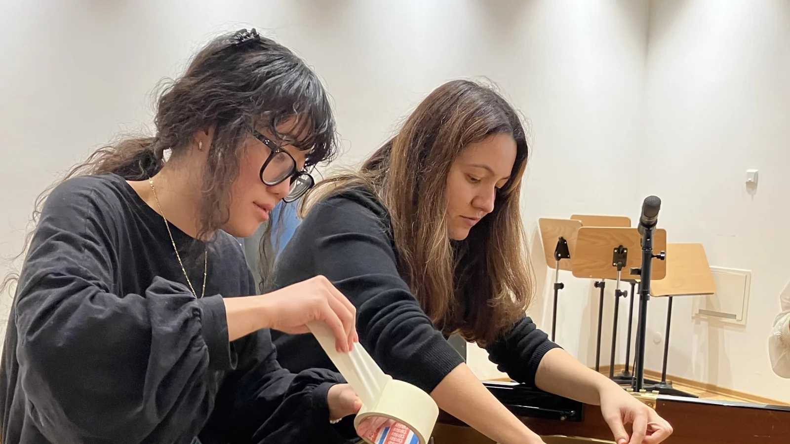 Beim „Goldenen Herbsttag“ führten die Musikerinnen und Musiker die Zuhörerinnen und Zuhörer auf einen klangvollen Spaziergang um das Klavier herum, während „Adventsabend“ Gedicht, Musik und das Klingen von Glas auf den Saiten zu winterlichen Klängen verband. Die eigens erstellten Partituren und Bilder wurden auf einer Leinwand gezeigt und gaben Einblick in die kreative Welt der jungen Komponistinnen und Komponisten.