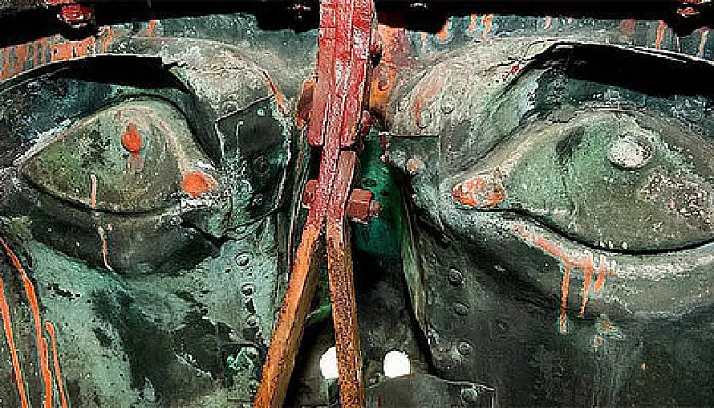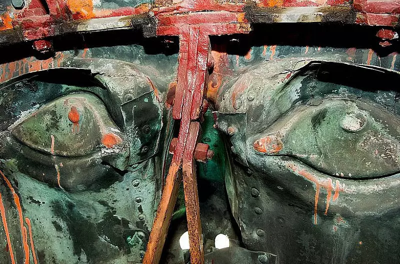 Die Frage kann mir Guide Michael Knost auch nicht beantworten. Der wartet schon und ruft von oben herunter, wohin ich treten soll. Die Abstände zwischen den Haken werden immer größer. Da sehe ich meinen Helfer, er schaut liegend aus einer Luke herunter - auf Hermanns Brusthöhe. Ich leuchte in die Luke hinein und sehe einen Teil von Hermanns Umhang. Jetzt sind es nur noch ein paar Meter. Und die muss ich allein bewältigen. Oben hilft mir keiner mehr. Eigentlich könne man bis in die Hand hinein klettern, hatte mir Guide Corbin erklärt, doch dort gibt es wenig Halt. Das Schwert hat einen Durchmesser von 50 Zentimetern.