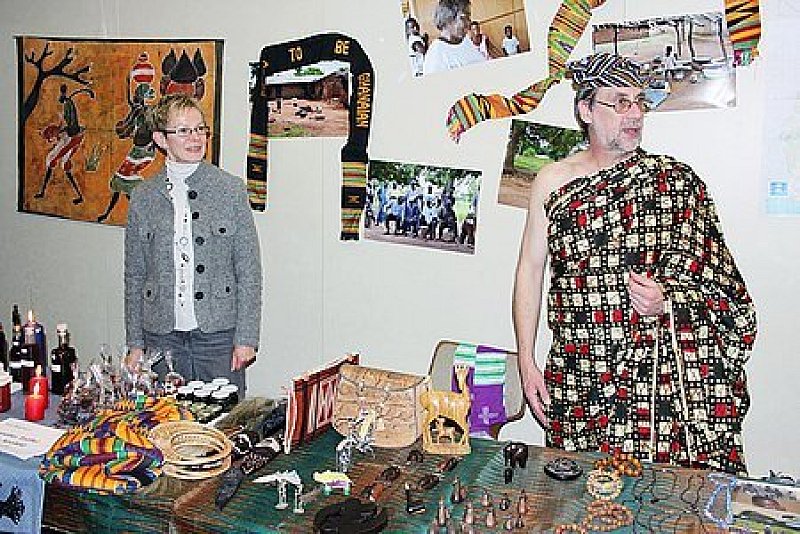 In seiner Häuptlingstracht aus Ghana, wo die Kirchengemeinde sich für den Aufbau einer Klinik engagiert, war der Pfarrer ein echter Hingucker für die Besucher.