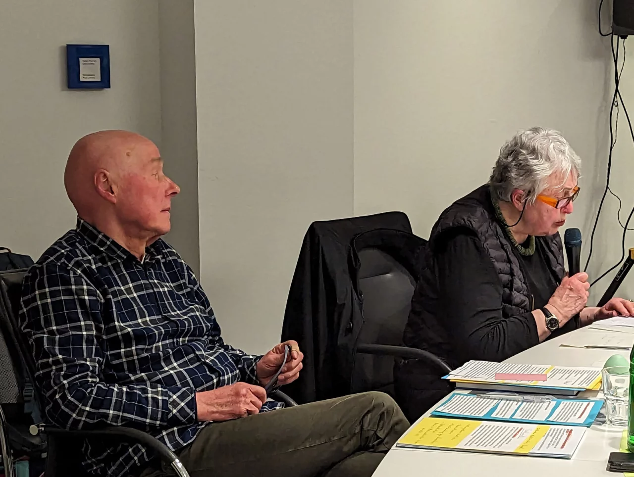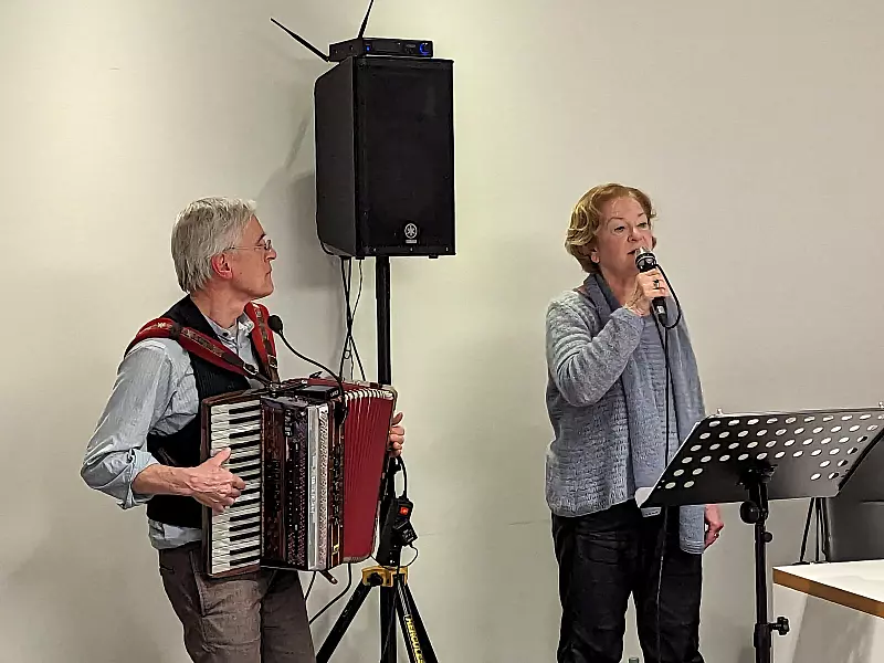 Um die Veranstaltung trotz oder wegen des schweren Themas etwas aufzulockern, gab es politische Musik von Sabine Unger und Harald Kießlich (von der Musikgruppe "Roter Faden").