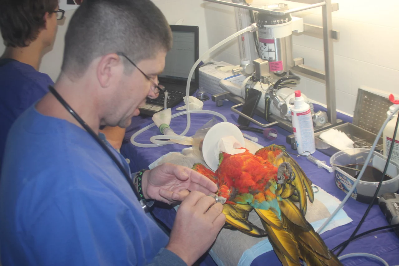 Sobald die Glocke wieder abgenommen wurde, konnten die Tiere Sauerstoff einatmen. In wenigen Minuten wurden sie wieder munter. Die Dauer dieser Phase sei ein aussagekräftiges Kriterium für den allgemeinen Gesundheitszustand des Papageien, erklärte der Experte. Wenn nach der Untersuchung die Behandlung eines Papageien erforderlich werde, setze er etwa mit Mikrochirurgie möglichst schonende Behandlungsmethoden ein.