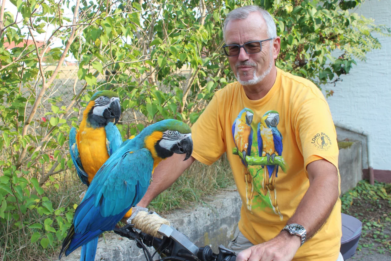 Durchschnittlich 110 Papageien leben in der großen Halle des „Papageienparadieses Busse" in Humfeld. „Einstein" und „Lady" dürfen tagsüber in einer Voliere vor der Haustür die Besucher begrüßen. Vor dem Abendessen machen sie aber gerne noch eine kleine Radtour durch die Landschaft rund um den Ort. Dafür haben sie mit Monika und Wolfgang Busse „Personal" als Fahrrad-Chauffeur. Am Wochenende wechseln sie dann auch schon mal ins Auto als Beifahrer oder machen zusammen mit Familie Busse eine Bootsfahrt auf der Weser, dann aber mit Sicherheitsgurt um die Federn, damit kein ungewolltes Bad in den Weserwellen den Spaß beeinträchtigen kann. Nach solchen Ausflügen wartet ein Napf mit Körnern, die Obstschale mit Bananenscheiben oder der Gemüseteller, denn gesunde Ernährung ist auch für die Vögel wichtig.