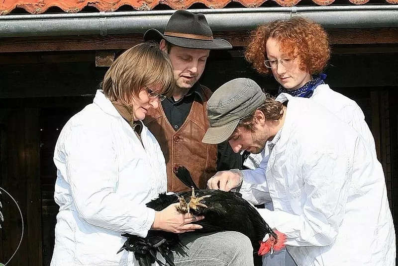 Dr. Ulrike Jannsen-Tapken, Diplom-Agraringenieurin Silvia Wittig und Biologie-Laborant Maik Przyklenk vom Institut für Nutztiergenetik, die mit Hofbesitzer Thomas Hinze um den Hahn herumstehen, trachten ihm nicht nach dem Leben sondern nur nach seiner Erbsubstanz, der DNS.