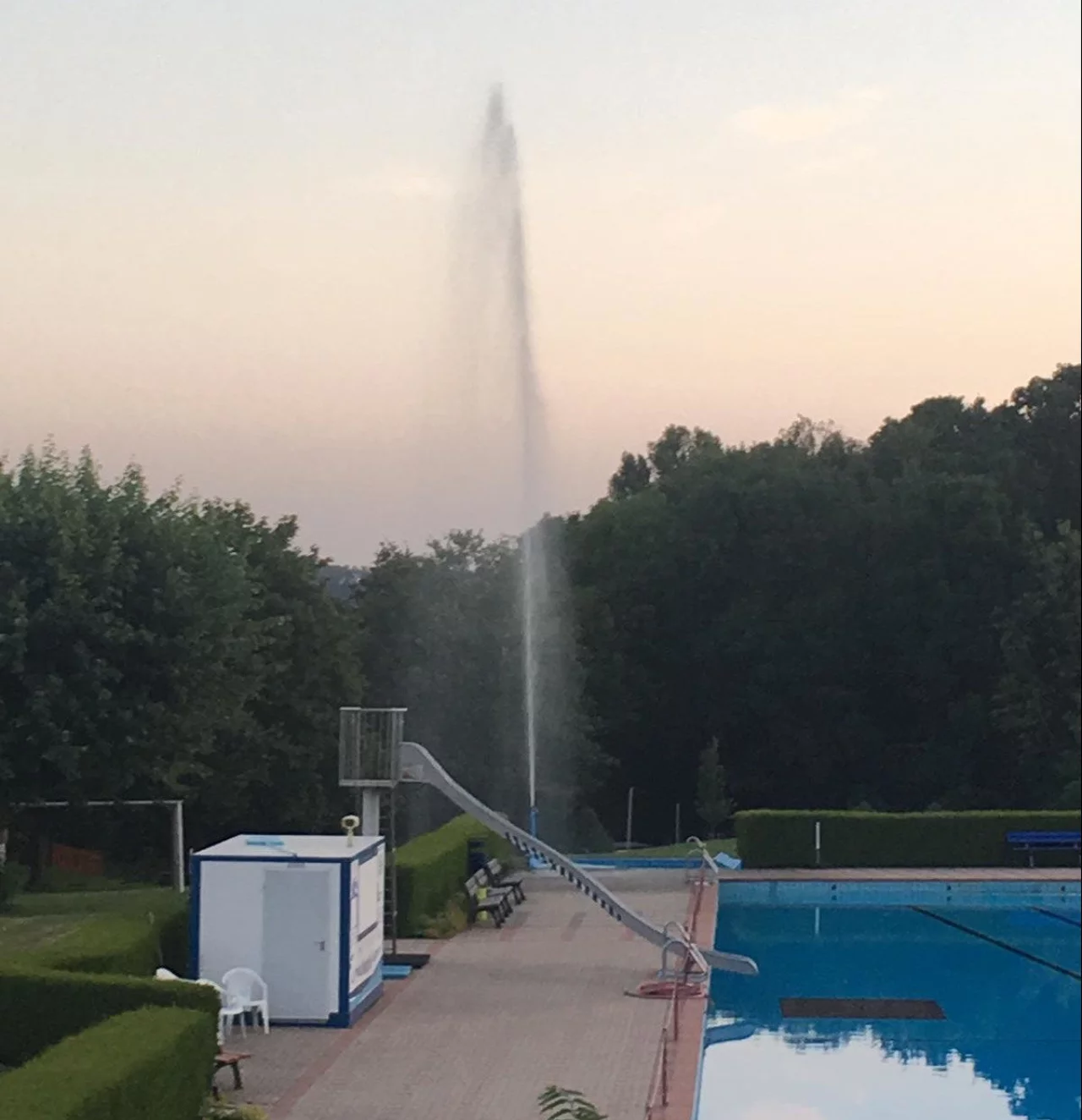 Anlieger bemerkten die Fontäne am frühen Morgen und benachrichtigten den Notdienst des Wasserwerkes, der wiederum gegen 5.30 Uhr Schwimmmeister Marcus Riesmeier alarmierte. Bis zum Badebeginn am Mittag war der Schaden wieder gerichtet.
