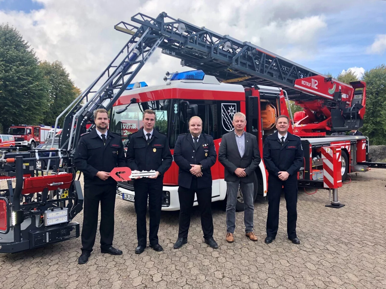 Bürgermeister Frank Meier überreichte den Fahrzeugschlüssel im Beisein vieler Wehrkräfte sowie von Vertretern aus Politik und Verwaltung an die Maschinisten des Löschzugs Bösingfeld. Diese seien in den vergangenen Wochen intensiv in der Handhabung des modernen Geräts geschult worden, teilt die Extertaler Wehr in einer Pressenotiz mit.