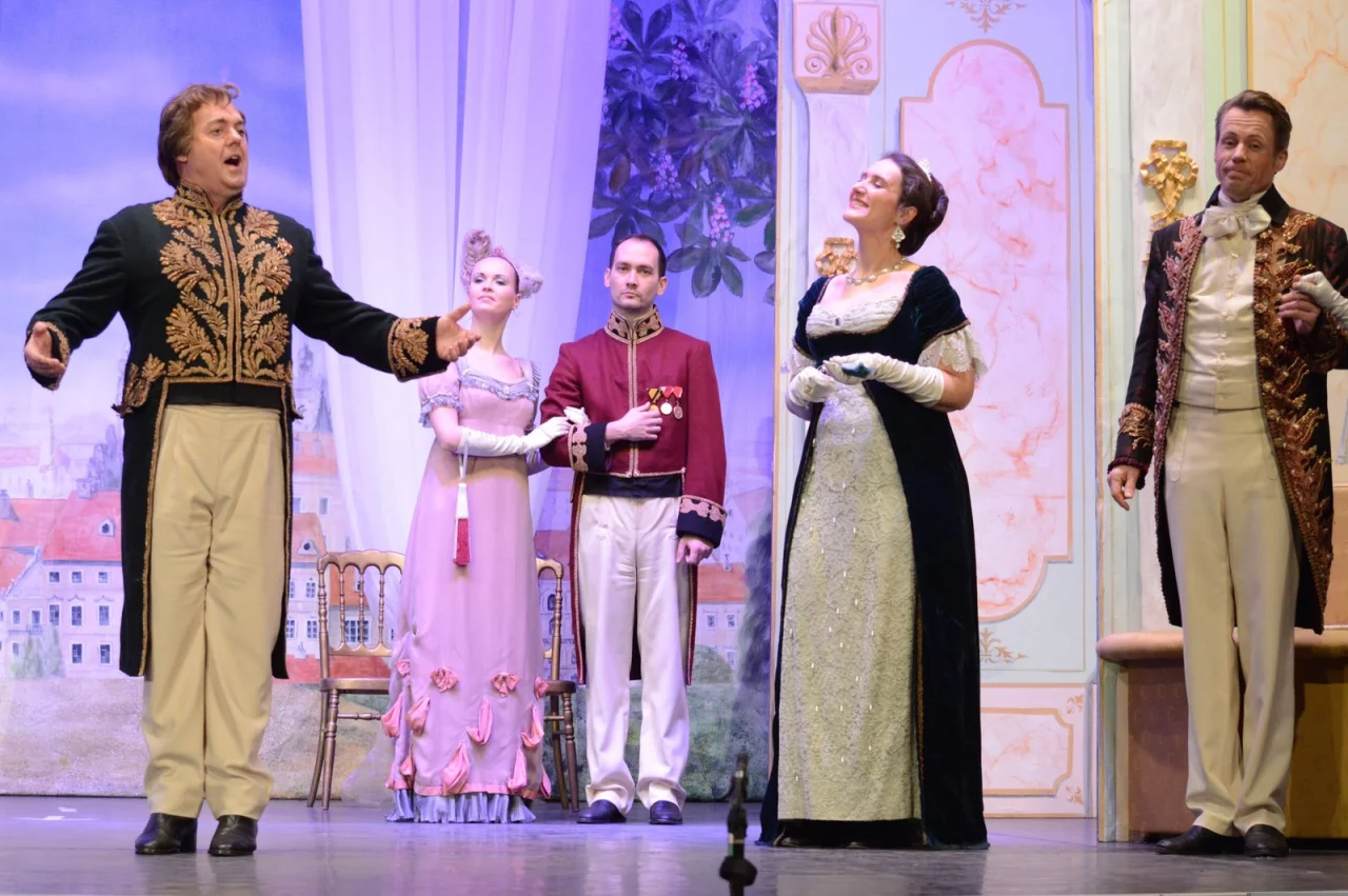 Neben dem „Zigeunerbaron“ sowie der „Fledermaus“ ist sie eines von Strauss bekannteren Werken, in dem allerlei Hochwohlgeborene auf die Schippe genommen werden. Vor dem Hintergrund des Wiener Kongresses um 1815 dreht sich dabei vieles um Graf Balduin Zedlau (Giorgio Valenta), einen Diplomaten aus Reu-Schleiz-Greiz. Vor einiger Zeit erst mit der Wiener Komtesse Gabriele (Anja Markwart) vermählt, wurde er von ihr nach kurzer Zeit schon wieder verlassen.