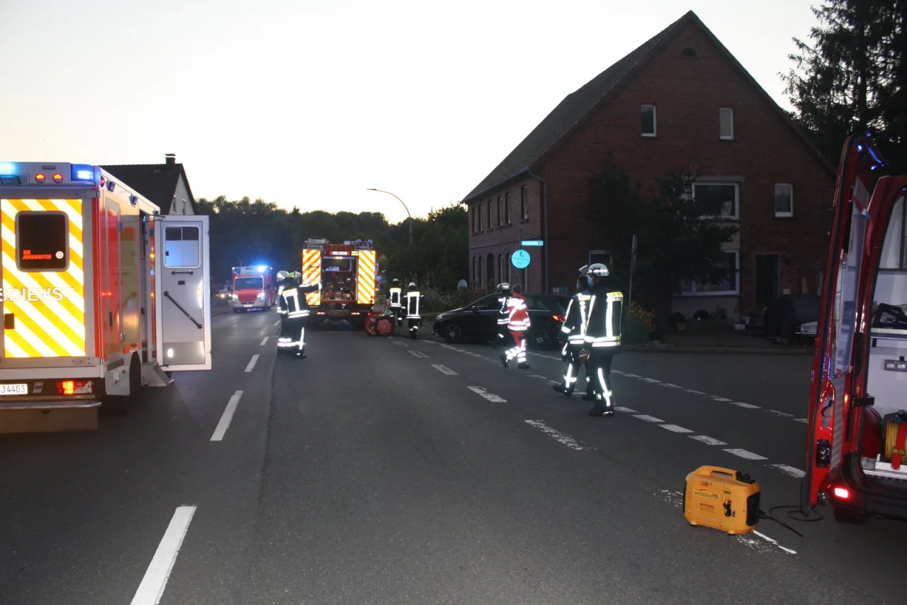 Horn-Bad Meinberg. Am Freitagabend wurde die Feuerwehr Horn-Bad Meinberg mit dem Stichwort "Feuer MiG (Menschenleben in Gefahr) - Zimmerbrand" gegen 20.50 Uhr in den Ortsteil Wilberg gerufen. An der Einsatzstelle in der Detmolder Straße quollen bereits Rauchwolken aus dem Gebäude. Ein Trupp unter Atemschutz löschte sodann mit einem C-Rohr das Feuer in der Küche. Danach wurde die Wohnung ausgiebig belüftet. Drei Menschen konnten die Brandwohnung erst im letzten Augenblick verlassen und wurden mit Verdacht auf Rauchvergiftung mit Rettungswagen ins Klinikum Lippe gebracht.