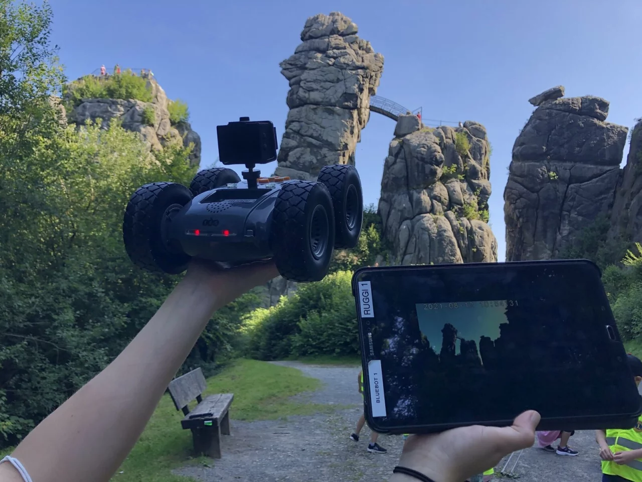 In Projektteams haben die Kinder die Gelegenheit bekommen, die Rugged-Robots zu programmieren und fahren zu lassen. Außerdem demonstrierte Gieseker den Kindern mit einer Kamera, wie man mit Hilfe der Roboter von den Externsteinen und der Umgebung einen Film drehen kann.