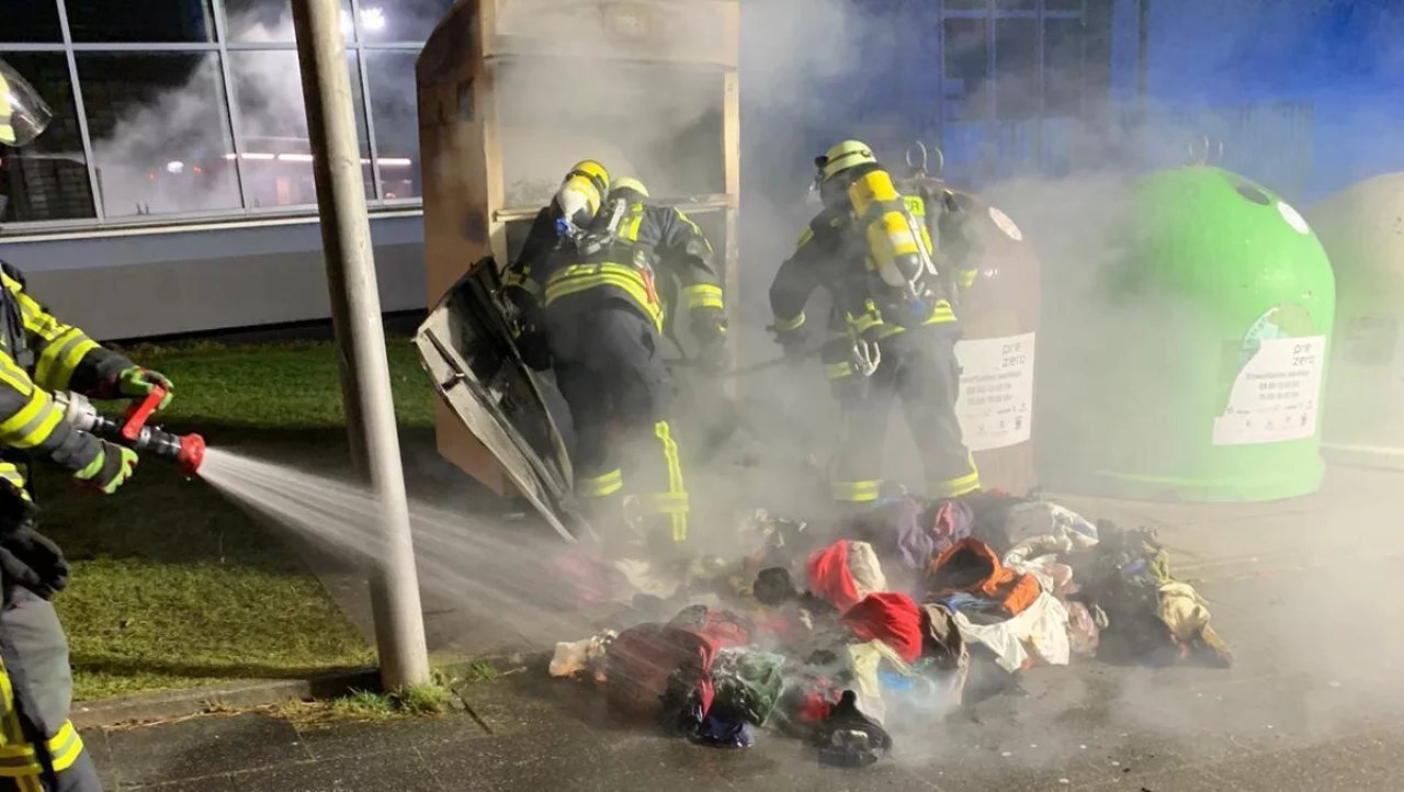 Altkleider-Container und Mülltonne brennen
