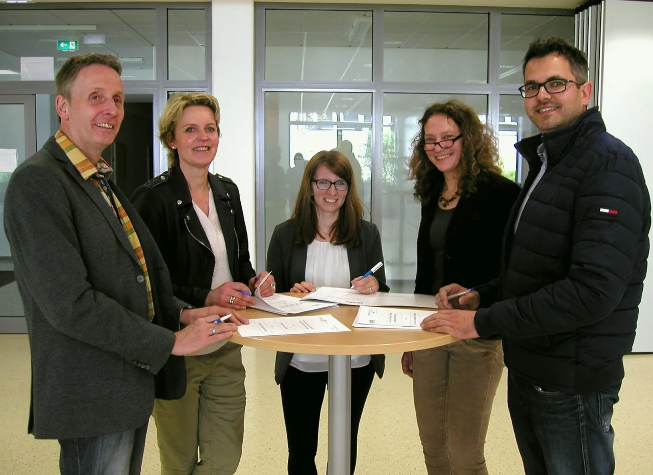 Neben Anja Ackermann, Geschäftsführerin des Seniorenheims „Mittendrin im Kalletal", war auch Julia Hey, Personalsachbearbeiterin des Kalldorfer Rollstuhlherstellers Meyra, bei der Unterzeichnung der Vereinbarung zugegen. Dritter im Bunde war Jens Strate von der Geschäftsführung des benachbarten Kunststofffertigungs- und Werkzeugbaubetriebes Claus Groth.