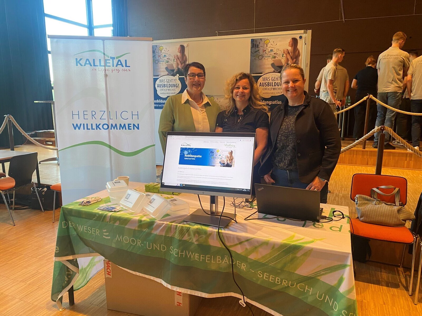 Beim Ausbildungsatlas handelt es sich um eine Internetseite, die Ausbildungsbetriebe und -berufe in den beiden Kommunen aufzeigt. Am Informationsstand des Berufsinfotages haben die Mitarbeiterinnen Ramona Lampe (Gemeinde Kalletal), Tina Meyer und Claudia Kohlstädt (Stadt Vlotho) auf das Angebot hingewiesen. Die Jugendlichen waren beeindruckt, wie schnell sie über die Internetseite „Ausbildungsatlas“ Informationen zu Ausbildungsbetrieben und -angeboten in der Region erhalten.
