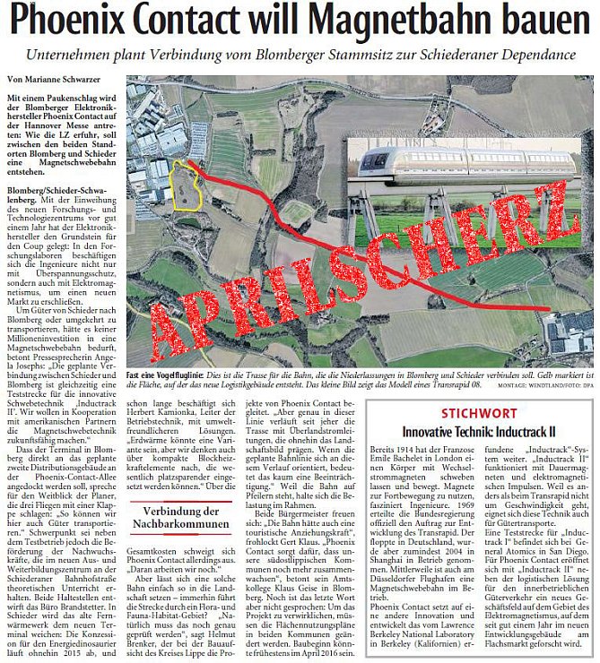Einige Zeitgenossen hat sie doch ins Grübeln gebracht, die Meldung über den angeblichen Bau einer Magnetschwebebahn zwischen dem Stammsitz von Phoenix Contact und der Schiederaner Dependance. Gleichwohl haben einige Leser in der Redaktion nachgehakt und sich vergewissert, dass es sich tatsächlich um einen Aprilscherz handelt.