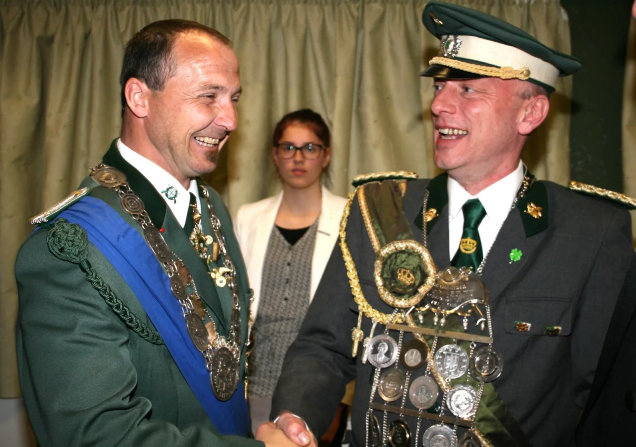 Erster Gratulant waren der scheidende Kreisschützenkönig Detlef Krüger von der Lemgoer Schützengesellschaft und der diesjährige Drittplatzierte Andreas Laux von der gastgebenden Schützengesellschaft Bösingfeld, gemeinsam mit dem Zweitplatzierten Ulrich Juckel von der Detmolder Schützengesellschaft.