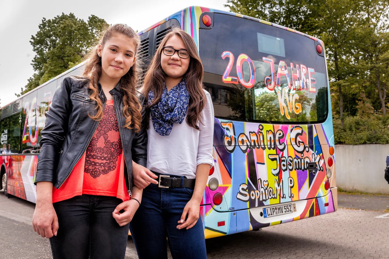 Ein festlicher Höhepunkt im Programm war schließlich die Enthüllung eines Busses, der anlässlich des runden Geburtstages neu gestaltet wurde. Und zwar durch Schülerinnen des Blomberger Hermann-Vöchting-Gymnasiums, die sich zuvor im Wettbewerb gegen etliche Schulen des Kreises durchgesetzt haben. Der bunte Bus mit der Handschrift der Blomberger Siebtklässlerinnen wird künftig auf der Linie 732 eingesetzt.