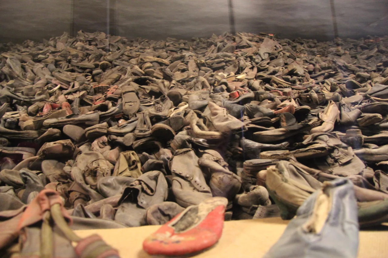 Meterhoch türmen sich Schuhe hinter zwei gegenüberliegenden Vitrinen in dem nächsten Block auf: 80.000 sind es geschätzt - bunte Frauenschuhe, schlichte oder schicke Herrenschuhe, kleine Kinderschühchen. In den nächsten Räumen Brillen über Brillen, Rasierpinsel, Haarbürsten, Kämme, Berge von buntem Blechgeschirr, Prothesen, Krücken, Korsetts, zahllose Koffer: "Klara Sar Goldstein Rotes Kreuz" steht auf einem. Gegenstände des Alltags, die die Deportierten nicht mehr brauchten. Massenhaft steht hier für Massenmord.
