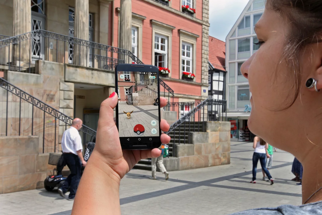 Auf meiner Karte blinkt ein kleines Tier neben mir auf. Ich klicke es an und das Display verändert sich. Ich sehe die vertraute Bepflasterung der Langen Straße, den Brunnen im Hintergrund, die Ladengeschäfte um mich herum und die Passanten, die verwundert an mir vorbeiziehen. In ihrer Mitte sitzt ein kleines gelbes virtuelles Vögelchen. Ich halte meinen Finger darauf und ziele. Mit dem dritten, wenig gekonnten Wischen nach oben schaffe ich es, einen Pokéball auf das Tier zu werfen. Der Ball öffnet sich und fängt das Tier. Es landet in meiner Sammlung.